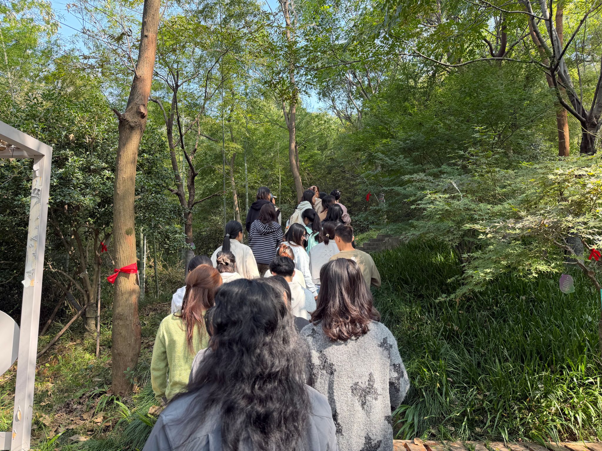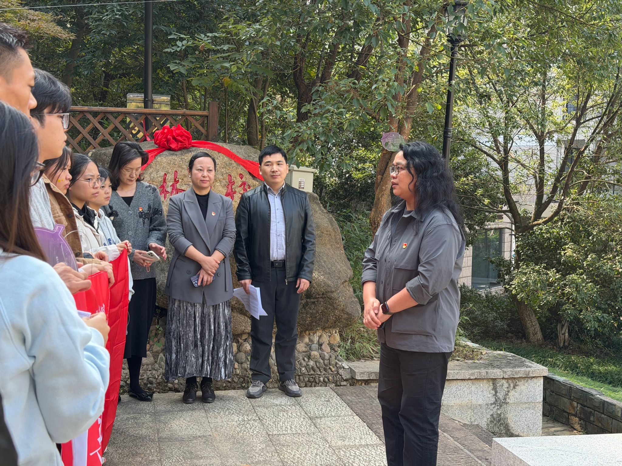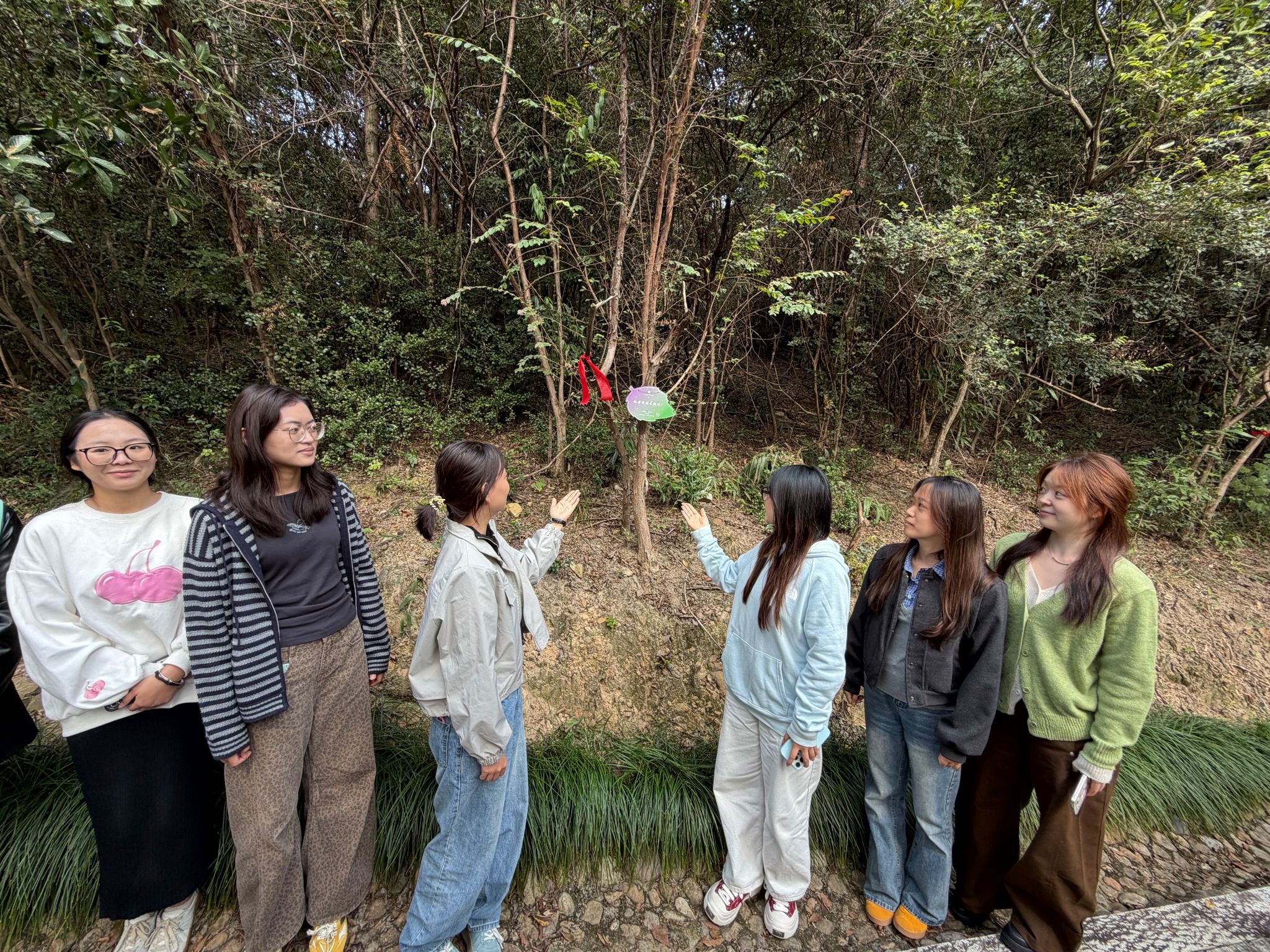 认领一棵树,就是认领一份牵挂;挂上一块牌,就是续写一段传承。不同年级、不同身份的党员代表把“课堂”搬进山林,在挂牌、感恩中完成了一场跨越届别的“思政接力”。认领仪式上,师生党员分组领取树牌,登上寻语山为员工树挂牌。拾阶而上,党员们品读着树牌上员工们写下的嘱托和期盼,精心挑选最合适的挂牌位置。为了让这份心意更好的传递,大家还详细记录了树木的位置和生长的环境,反馈给认捐的员工,并且在树下为认领树的员工录制了视频祝福,向远方的员工传递跨越时空的联结。