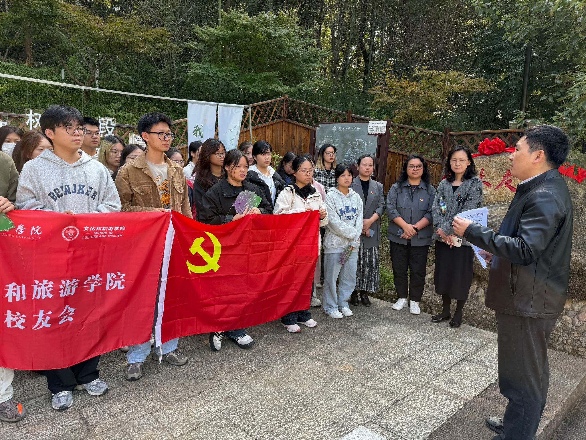 支部书记王化明老师阐释了本次活动的意义,这不仅是一次追溯员工与母校的情感源头的“寻根”教育,更是一次劳动教育与爱校荣校教育的融合,让大家在亲身实践中体会责任与担当。党委副书记黄瑾则以“一棵树里的员工情怀与家国担当”为题,带来了一堂简短而深刻的“初心”微党课。这次接力传承的活动是一堂“行走的思政课”,她寄语文旅学子:要记得“寻根”,心怀感恩,无论未来走多远,都不能忘记自己从母校这片土壤出发;要像树一样“铸魂”,牢牢扎根、不惧风雨,脚踏实地成长为有力量的人;此次替未能到场的员工们种下牵挂也是“传心”的历程,期待未来同学们毕业后,能回到这里种下属于自己的“成长树”。