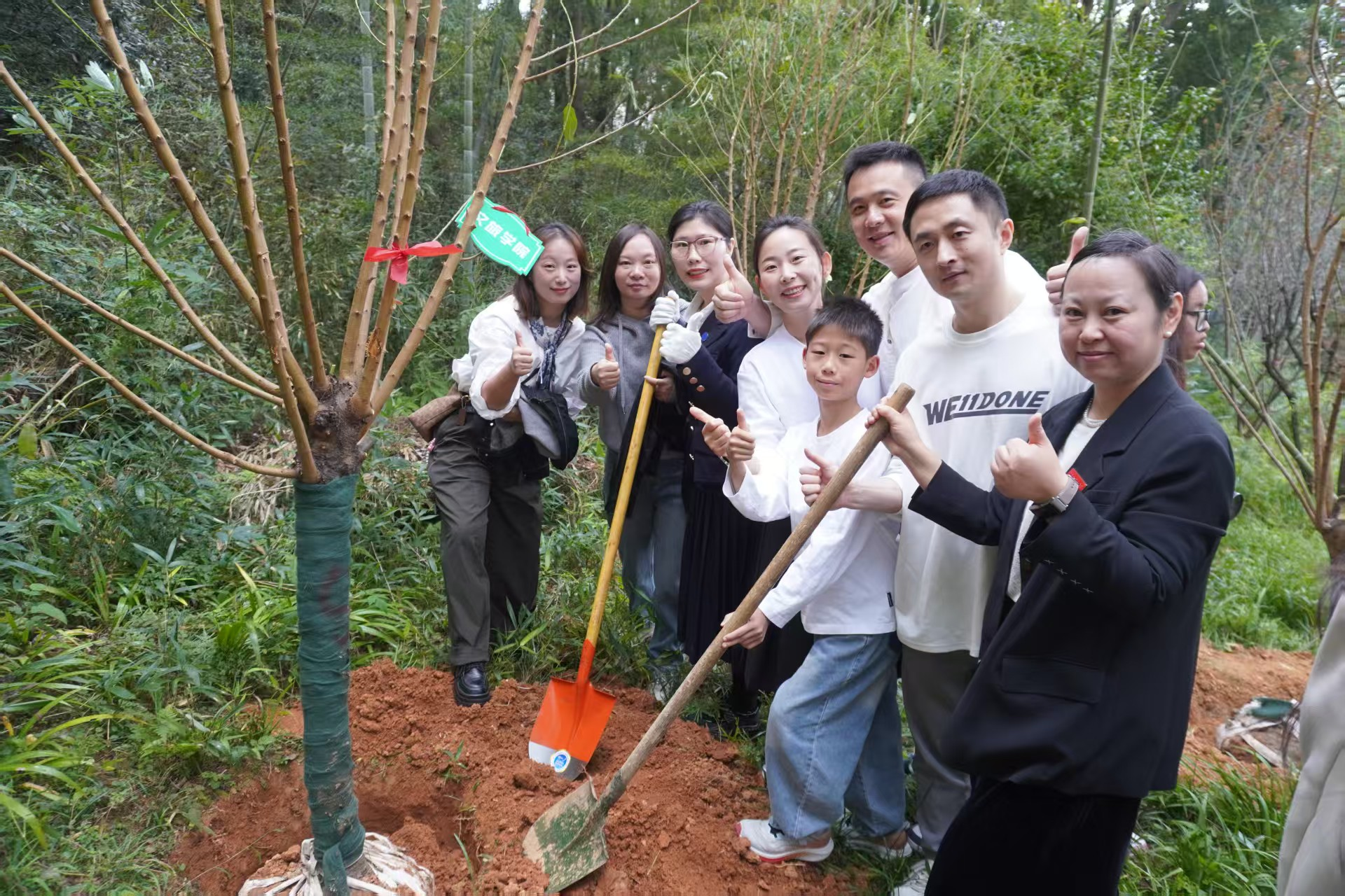 随后,师生携手挥锹铲土、栽种新苗,为树木挂上铭牌,在七秩校庆日留下最难忘的记忆。