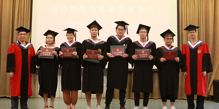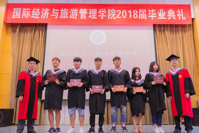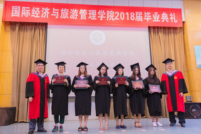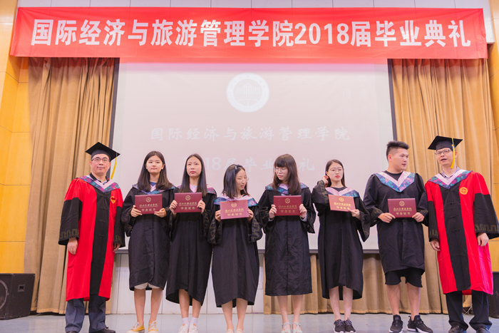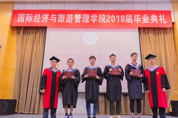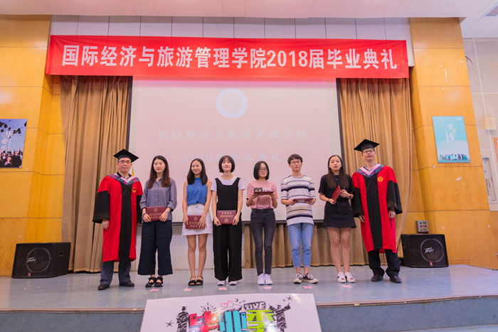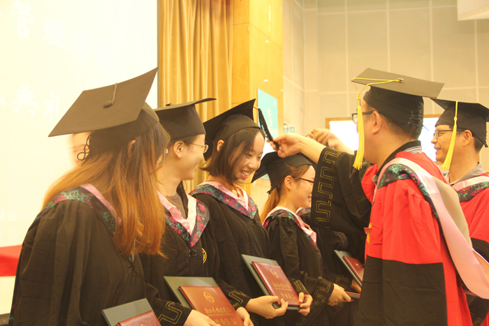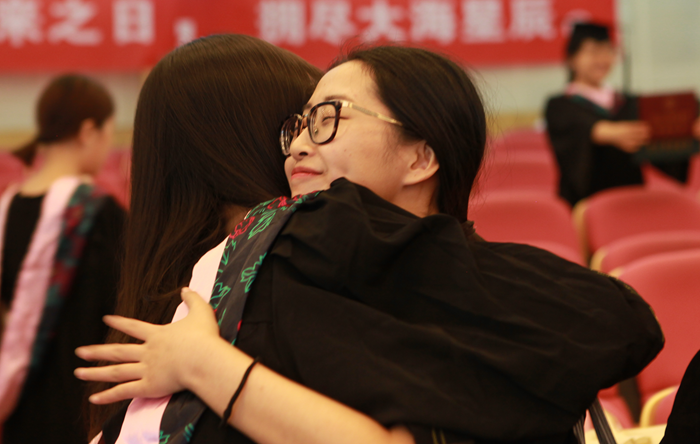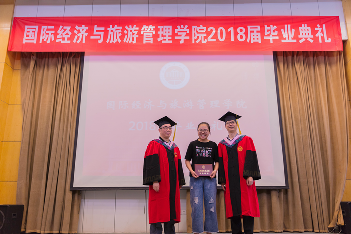 主持人声情款款的开场揭开了典礼的序幕。台下学子满座,学士服满堂,他们又是这样聚到了一起,却带有了离别的符号。紧接着,主持人宣读校优秀毕业生名单,公司经理赵银德教授,党总支书记俞海山教授为院各专业优秀毕业生颁奖。随后,各班班长上台领取毕业奖品。接过装饰精致的礼盒,各班代表不禁好奇这离别的最后一份赠礼究竟是什么呢?主持人展示了手中的钥匙扣,微笑着问:“大家可知道为什么发钥匙扣作为纪念奖品?”“因为公司是我们的家,永远为我们敞开回家的大门。”毕业生代表姚瑶的回答,让典礼染上了一份不知名的感动与温情。