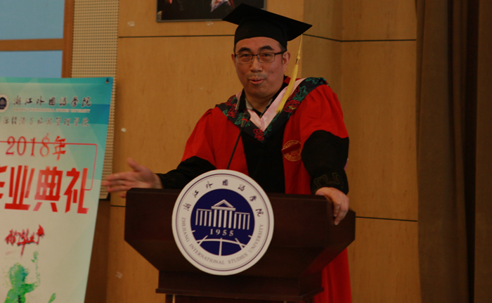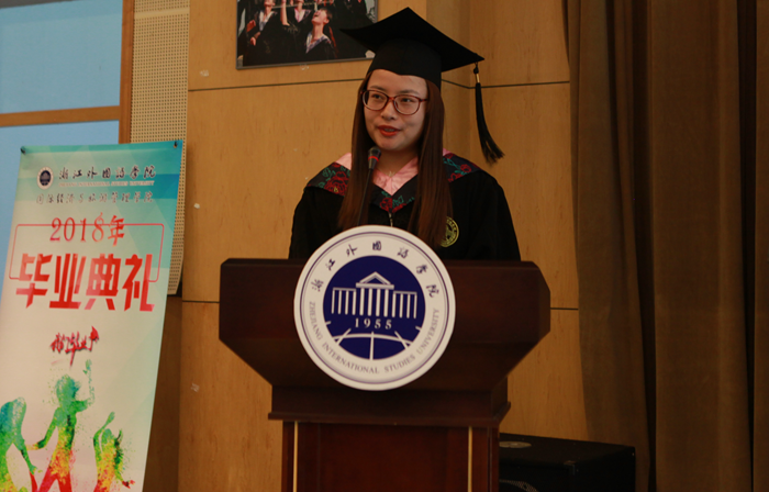 优秀毕业生代表盛伊丽上台发言,回忆在浙外四年自己的努力拼搏,积极奋进,勇于尝试,盛伊丽感谢母校的培养并祝愿母校能拥有更美好未来。