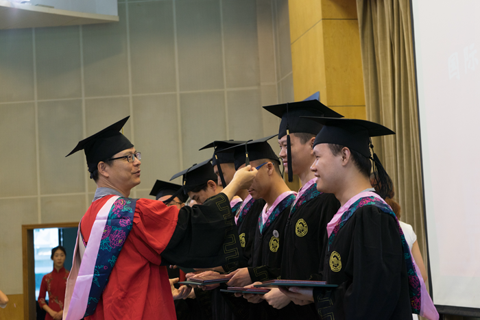 赵银德教授和俞海山教授为毕业生逐一颁发证书并合影。按下快门不过一瞬,而这一瞬便是回忆里的永远,亦是永远的不可再来。礼毕人散场,个个空了的座位却还留着最后的余温,仿佛那年今日,你第一次坐下的温度。