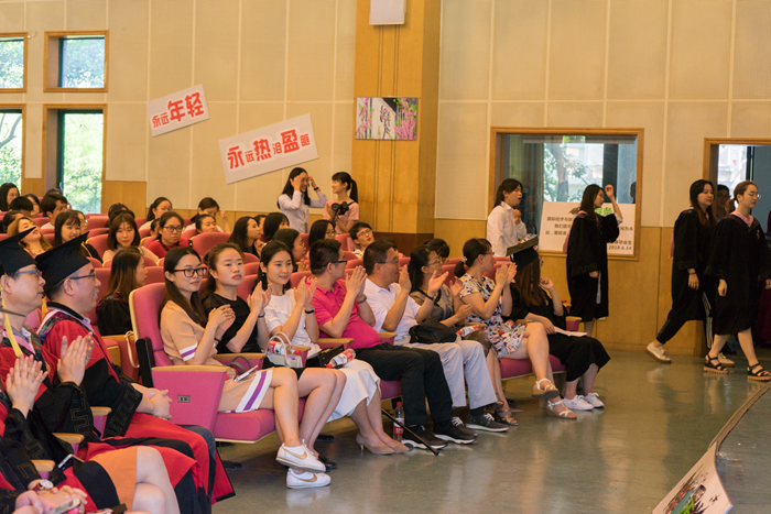 教师代表蒋艳教授上台致辞。她问毕业生们此时此刻的心情,问珍贵或遗憾的回忆,成长的历练与蜕变。一声声问候如春风微拂,如母亲的温柔体贴,饱含期望与祝福,祝愿每位同学发自内心热爱生活,勇敢面对人生的选择,认真对待每一件事情,珍惜并且享受当下。