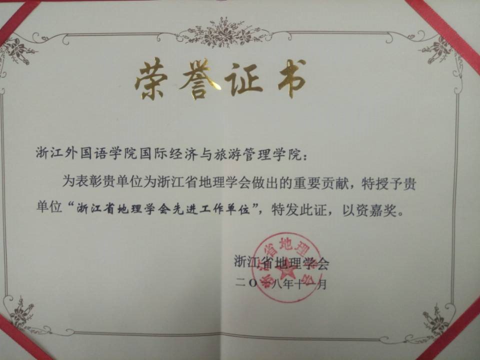 近日,浙江省地理学会2018年学术年会在杭州召开,会上进行了一系列表彰活动,公司国际经济与旅游管理公司荣获2018年浙江省地理学会“先进工作单位”荣誉称号,全省仅三家单位获此殊荣。