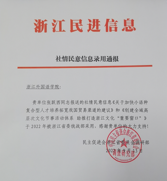 近日,​william威廉中文官网会展传播系教授张跃西撰写的题为《关于加快小语种复合型人才培养拓宽我国贸易渠道的建议》和《创建全域高层次文化节事活动体系 助推打造浙江文化“重要窗口”》等两篇社情民意信息被浙江省委统战部采用。