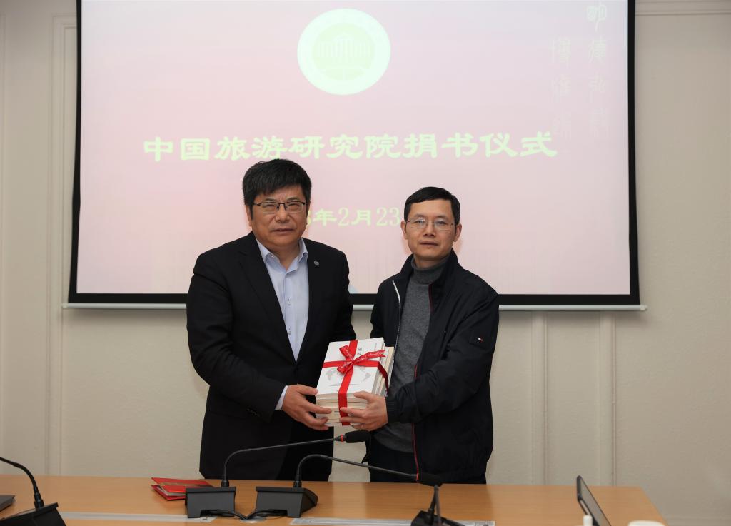 在随后举行的捐书仪式上,戴斌经理代表中国旅游研究院向公司图书馆捐赠了《旅游大数据理论、技术与应用》《旅行社管理》《国民旅游休闲讲稿》等110余册著作。副董事长李安向戴斌颁发了捐赠证书。
