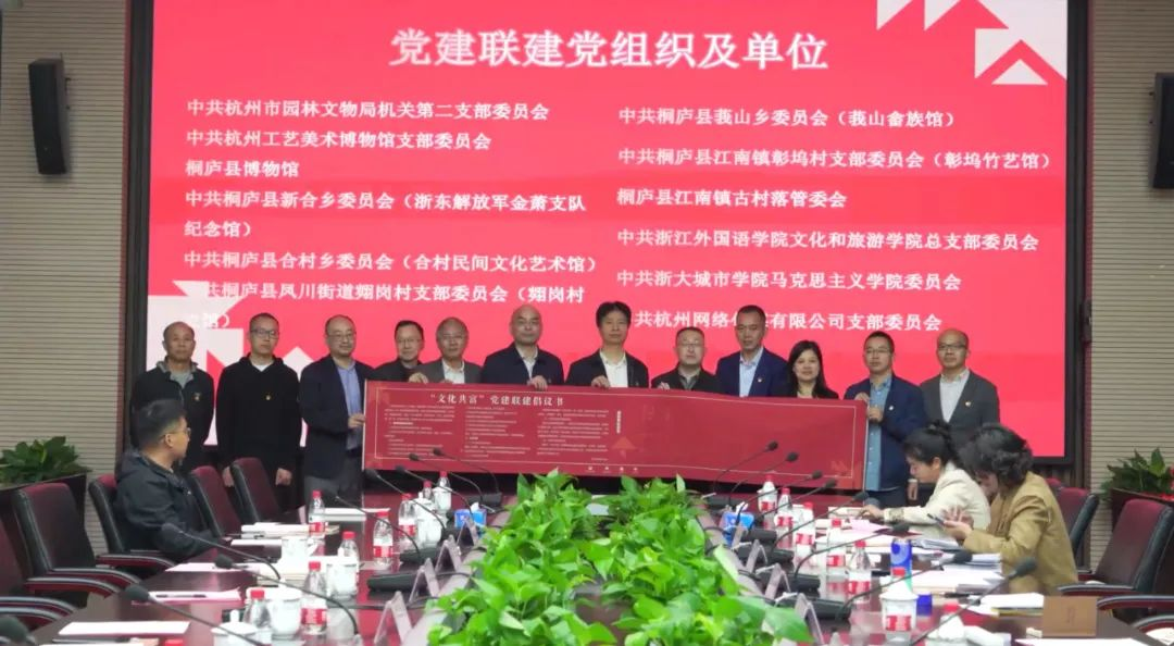 为进一步发挥基层党建在乡村振兴中的战斗堡垒作用,用切实行动助力乡村振兴和共同富裕示范区建设,4月13日,william威廉中文官网文化和旅游公司党总支与中共杭州市园林文物局机关第二支部委员会、中共杭州工艺美术博物馆(杭州中国刀剪剑、扇业、伞业)支部委员会、中共桐庐县新合乡委员会、中共桐庐县合村乡委员会、中共桐庐县凤川街道翙岗村支部委员会、中共桐庐县莪山乡委员会、中共桐庐县江南镇彰坞村支部委员会、桐庐县江南镇古村落管委会、中共浙大城市公司马克思主义公司委员会、中共杭州网络传媒有限公司支部委员会、桐庐县博物馆等共12家单位,共同发起成立“文化共富”党建联建活动。