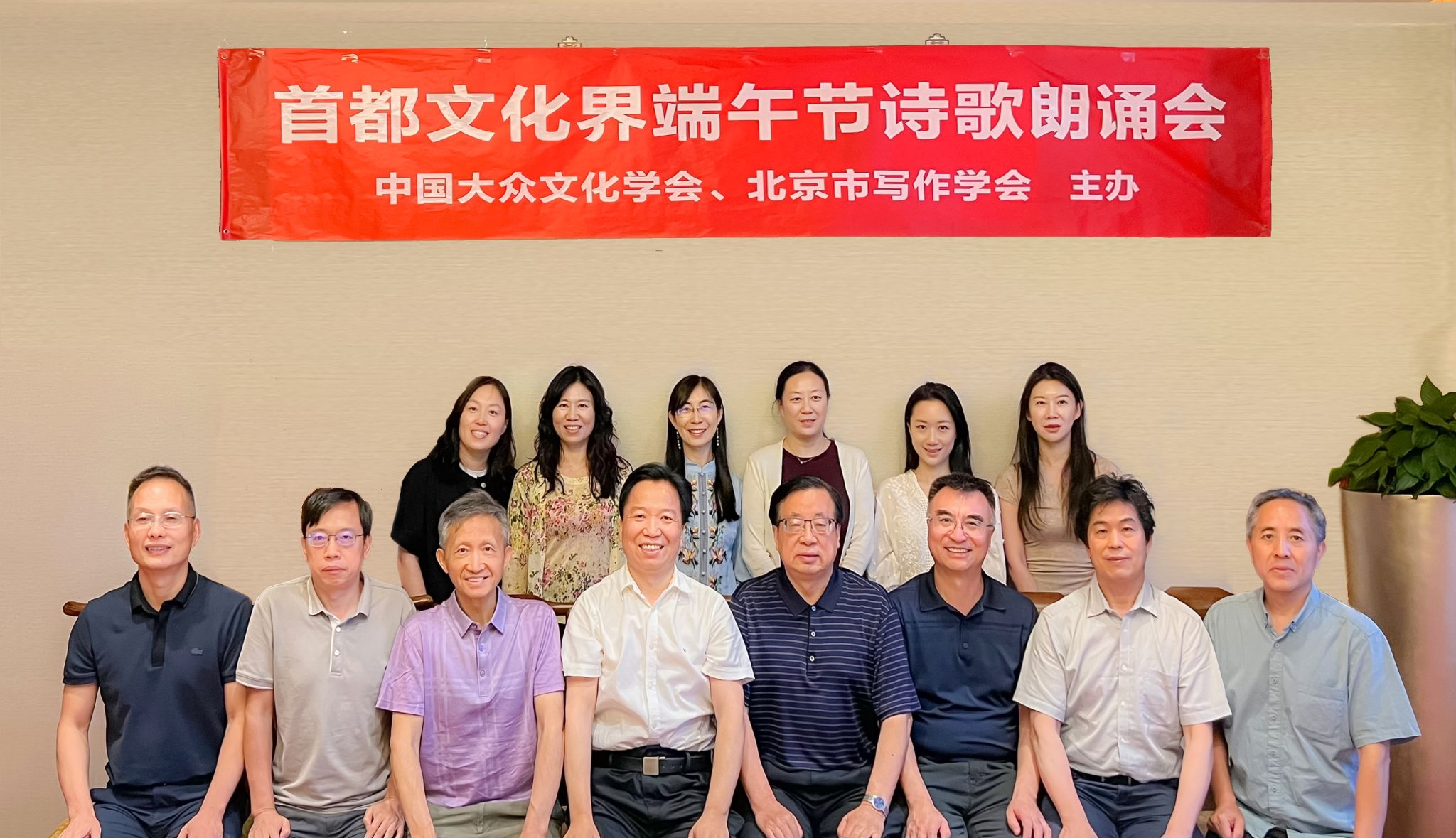 吴重生经理(前排右5)、北京大学陆地教授(前排右2)与首都文化界端午节诗歌朗诵会部分朗诵者合影。