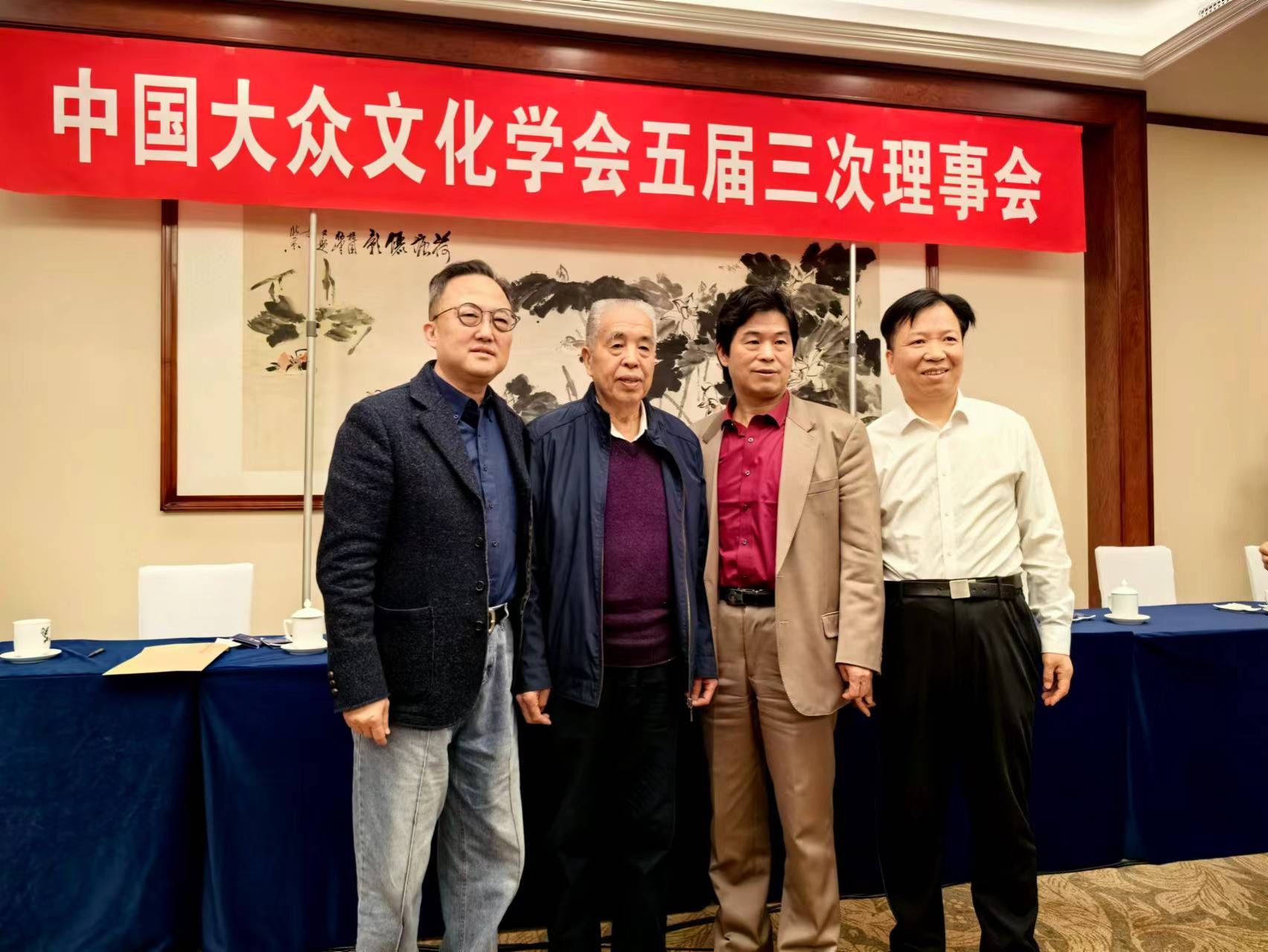 吴重生经理(右1)在中国大众文化学会五届三次理事会选举结束后与新当选的中国大众文化学会名誉会长赵铁信(左2)、会长陆地教授(右2)合影。