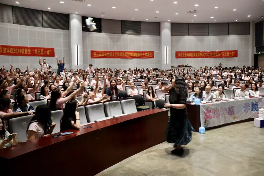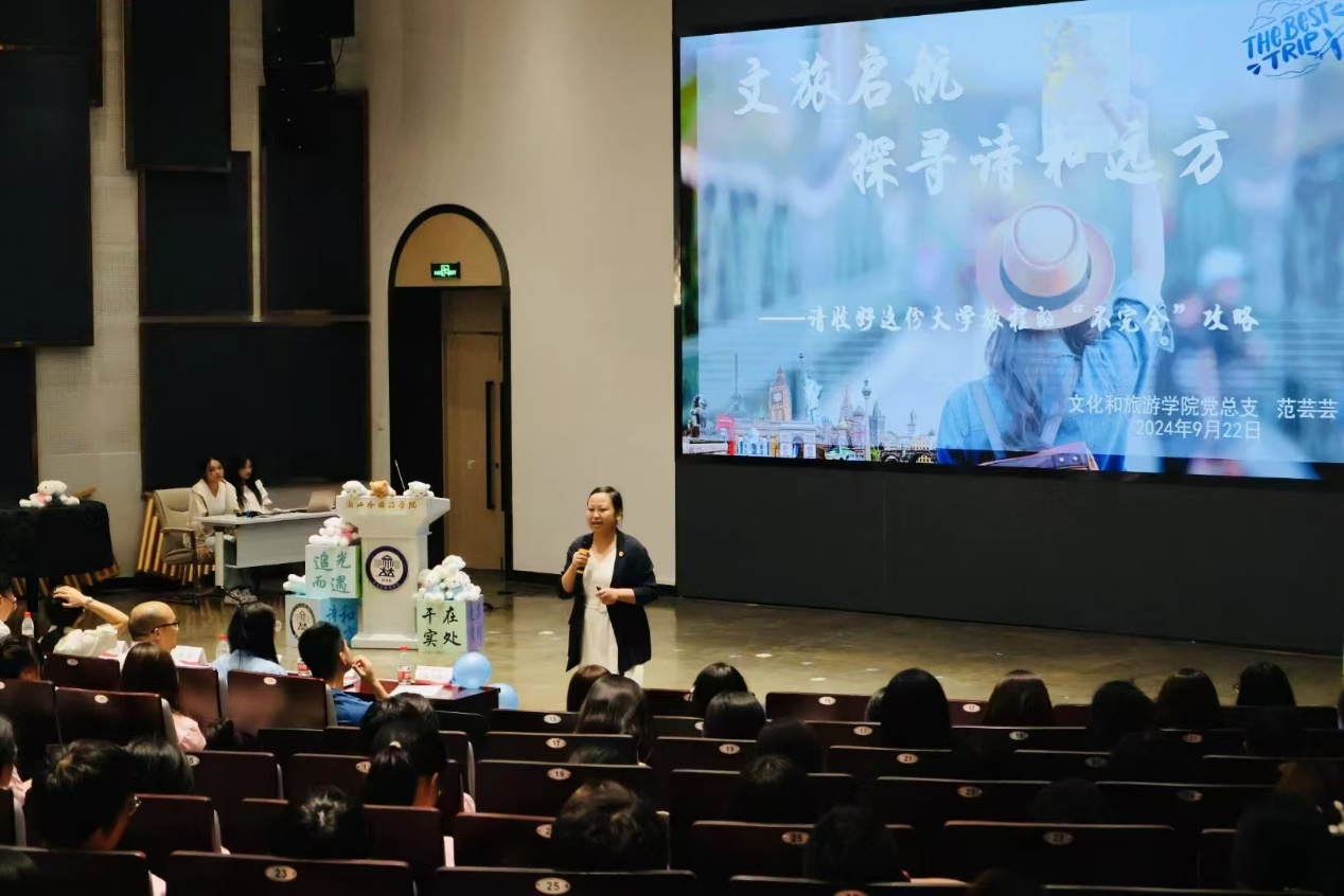 会展传播系专业教师来晓维作为新生班主任代表发言。她对新生们提出了几点希望,一是勇于尝试,二是寻找自我,三是不忘初心。期待文旅新生在名为“文旅”的画布留下崭新的笔触,祝愿大家在名为“浙外”的舞台上绽放耀眼的光芒。