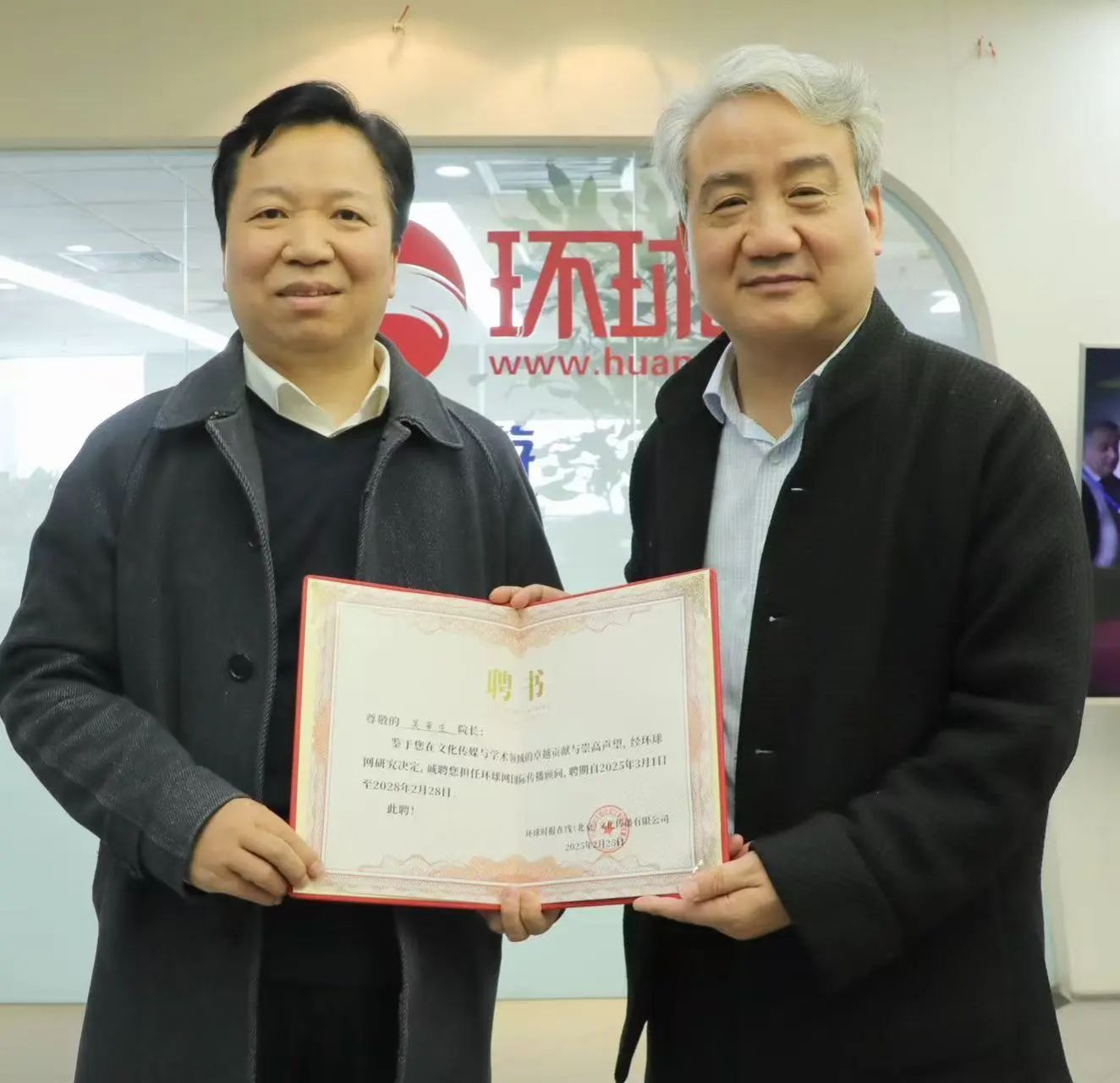 3月10日,环球网总裁单成彪在环球网北京总部代表环球网向吴重生经理颁发国际传播顾问聘书。