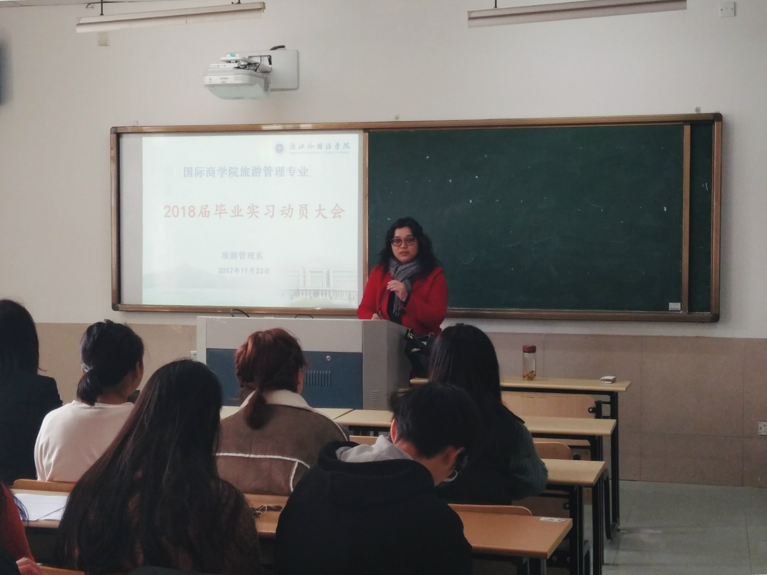 宣讲会由旅游系黄瑾老师开场,对毕业生们的实习安排进行相关介绍。