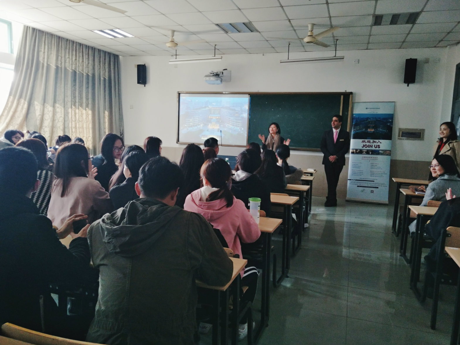 六家企业就公司理念、岗位招聘、员工生活与毕业生们进行了深度交流介绍。最先为大家做宣讲的是杭州温德姆大酒店刘总监与外籍前台经理对同学们展开宣讲,对岗位职能进行了细致分析。紧接着柏悦酒店的负责人通过宣传片的放映加深了毕业生们对该酒店认知,在介绍各部门总监时询问同学们感兴趣的职位,表示其公司有意愿接受大量人才。