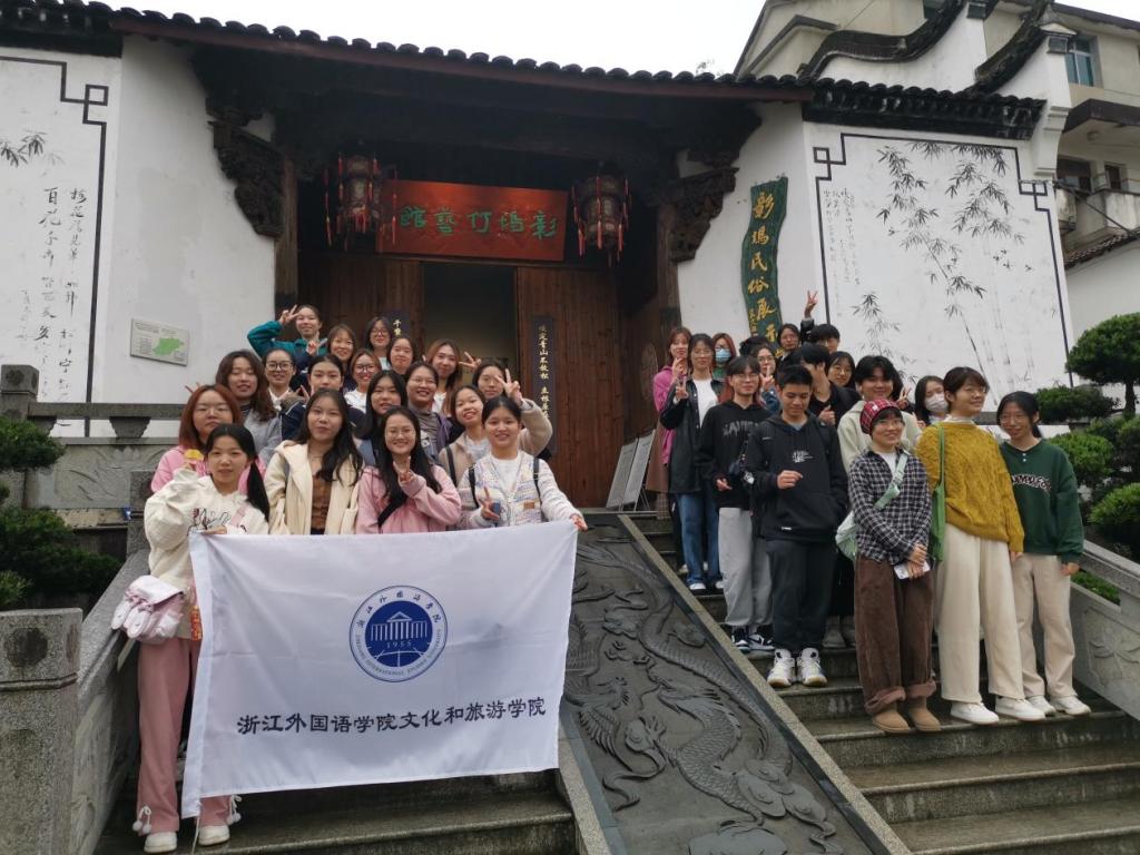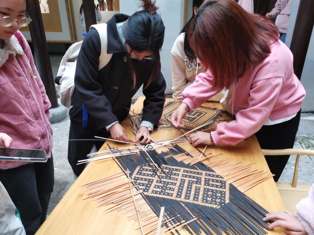 “十月江南天气好,可怜冬景似春华。”在前几日经历了一场秋雨之后,江南镇的空气显得格外清新。江南镇位于桐庐县东部,地处富春江南岸,与杭州市富阳区接壤,是一座具有深厚古韵的魅力新城。新时代乡村生活样板地彰坞村、充满江南古韵的深澳村……新乡村、新生活,一幕幕充满活力的场景,无不令同学们心神向往。上午10时许,参加实地教学的师生们首先抵达了彰坞村。在村内负责人的带领下,师生们前往彰坞竹艺非遗展示馆进行参观,现场感受竹艺文化的魅力,并引发了同学们对当前我省正在建设的乡村博物馆认同、赞许和共鸣:“开阔眼界、展品精美、受益匪浅。”“文化气息浓厚,通过竹艺可以让竹子变成形形色色的东西。”“丰富多样的竹艺非遗产品比较充分地展示了传统竹艺,互动的大屏科技含量也比较高。”“很亲切,小时候看到妈妈也用竹子编家具。”有同学参观体验后叙述道:“进入展示馆,竹艺非遗文化的历史感和清新感扑面而来,沿着展示馆的路线循序渐进地深入,对彰显坞村的竹艺非遗文化的了解慢慢增加。展示馆在内容丰富的同时又不失趣味,让人不知不觉地一直看下去,直到走出展示馆还意犹未尽、回味无穷。竹艺非遗展示馆很好的展现了彰坞村竹艺非遗文化的传承和发展过程,是一个很有意义的展示馆,对我的吸引力比较大,我很喜欢。”