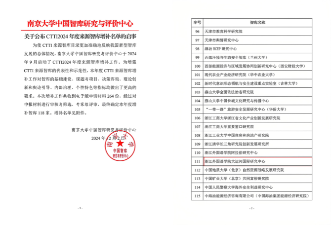 大运河国际研究中心成功入选中国智库索引(CTTI)来源智库