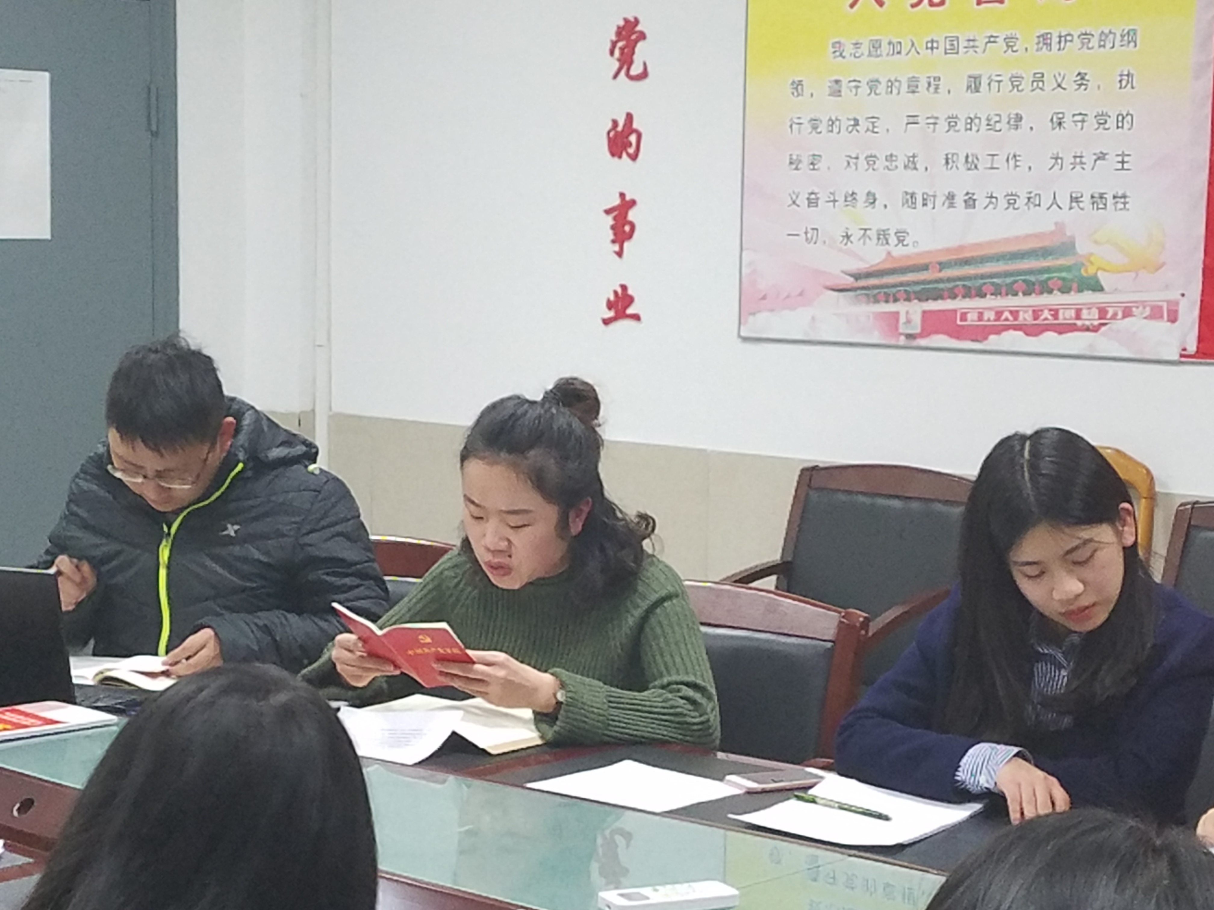 会上,支部党员人手一本红色的新的《中国共产党章程》,一份打印的党的十九大报告关于党的建设重点,从党章的第一页到最后一页,从支部书记到预备党员,党员同志通过大声接力地朗读,逐章逐条、逐字逐句地学习党的章程,领悟习近平总书记新时代中国特色社会主义思想,加深对党的领悟,明确党员的使命担当。