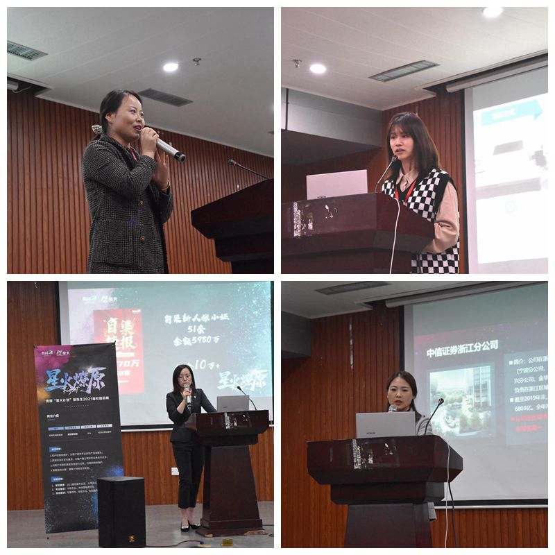 之后,杭州百家荟对外贸易集团的招聘宣讲负责人对该公司进行了详细的介绍。中信证券浙江分公司的招聘负责人通过系列数据展示了中信证券的实力。奥园地产集团招聘负责人就公司整体情况和实行的星火管培项目进行了详实的介绍和推广。