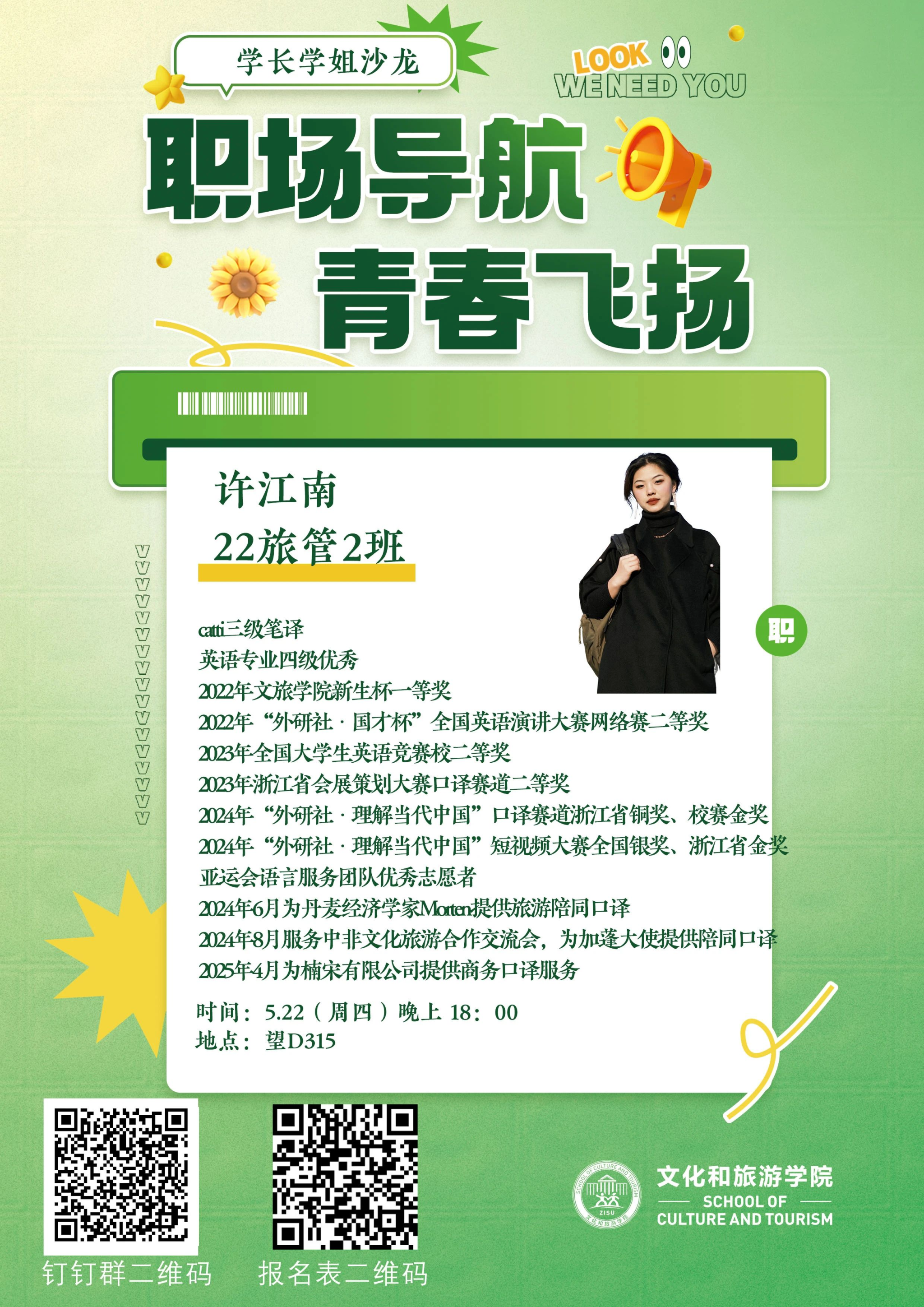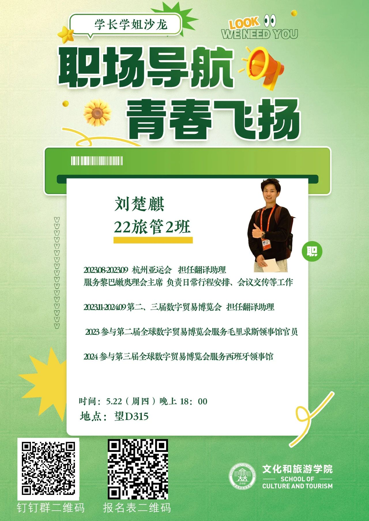 大家是不是经常好奇那些“语言大神”和“外事达人”是如何练成的?这次,文旅菁英荟邀请了经验丰富的学长学姐,为大家揭秘语言学习技巧以及参与外事活动的实战经验,干货满满,快来参加吧!活动现场还可以与学长学姐面对面交流,共同探讨语言学习的方法。