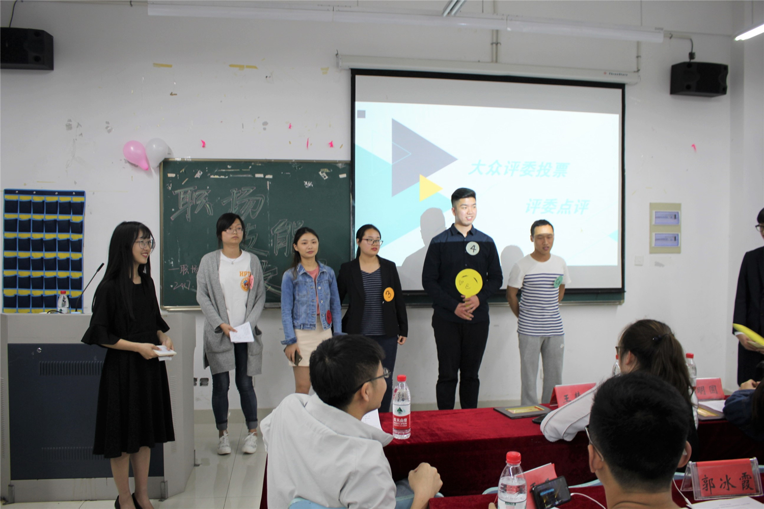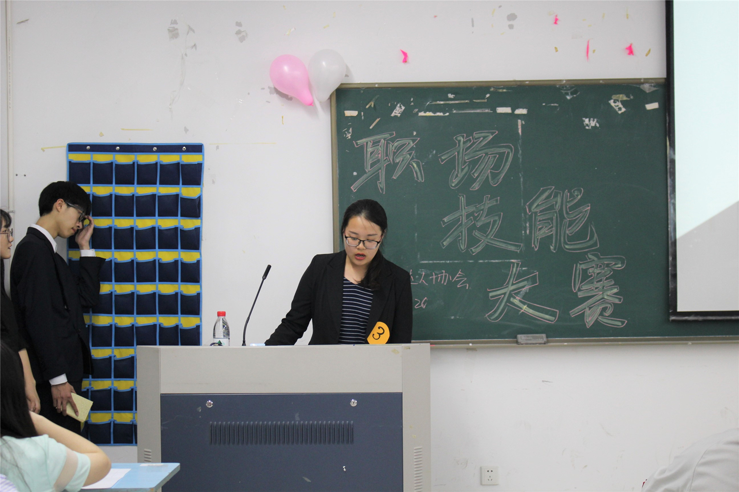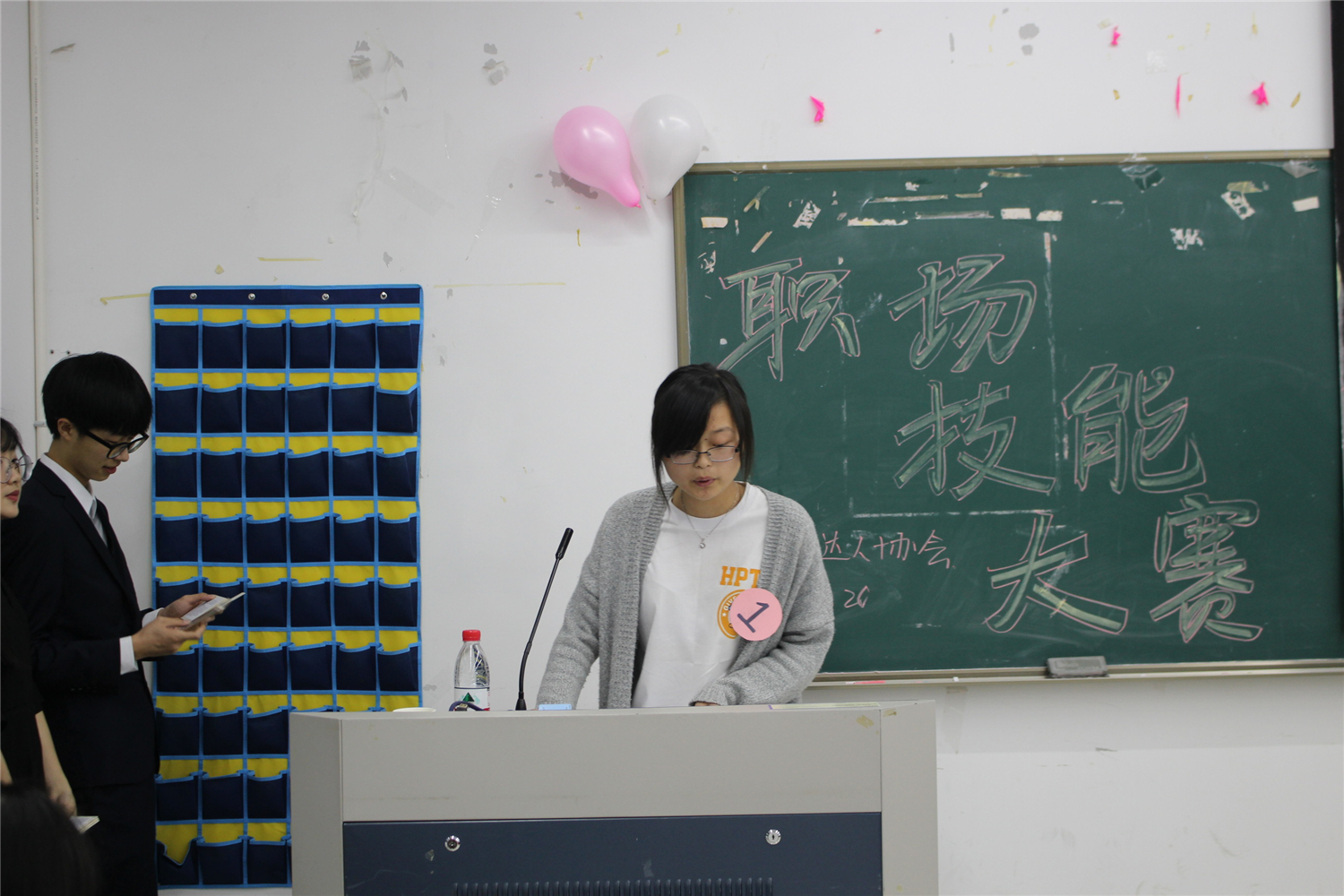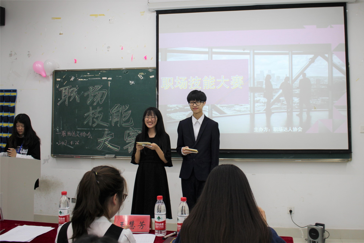 4月20日晚6点半,由公司员工会职场达人协会主办的职场技能大赛在品院A209顺利举行,公司辅导员赵冬冬,礼仪社社长张明圆,员工会主席彭于凡,副主席杨雅婷以及员工国际文化交流中心负责人郭冰霞应邀到场,同时来自高顿财经的特邀嘉宾王慧芳老师也出席了本次大赛。