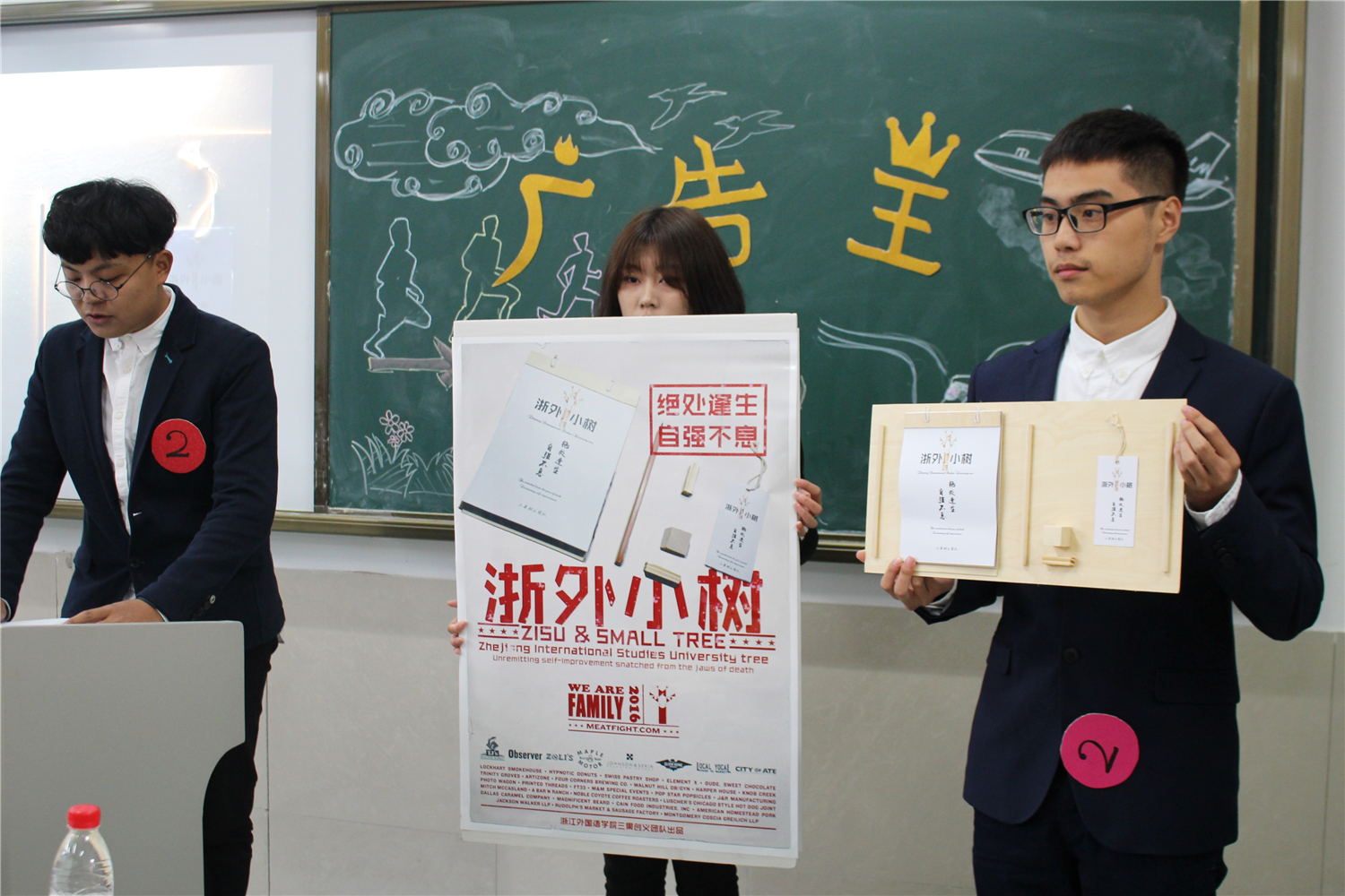 大赛共分为三个环节:现场演说,广告评析和现场即兴广告表演。在现场演说环节,第一组选手的“爱在灵峰”讲述了发生在公司超市中的故事;第二组的三果创义团队推出了浙外小树系列产品,诠释了从简思想;第三组把目光引入了浙外操场;第四组通过从前慢的主题让观众回忆起了从前的写信时光;第五组同学透过追梦堂,鼓励学子青春逐梦;第六组抓住了观众的味蕾,感受清真餐厅的风味;第七组推出爱盘行动,倡导同学们呵护餐具;第八组的奔跑吧浙外青年,展现了浙外学子的风貌。随后,进入广告评析环节,各组对随意抽取的广告进行观看评论,考验了选手对广告的理解能力。进入最后的现场即兴表演环节,选手们发挥所长,将主题表现的淋漓尽致,赢得了在场观众的阵阵掌声。最终,第三组、第八组、第五组获得三等奖,第一组和第二组获得二等奖,第六组摘得桂冠。