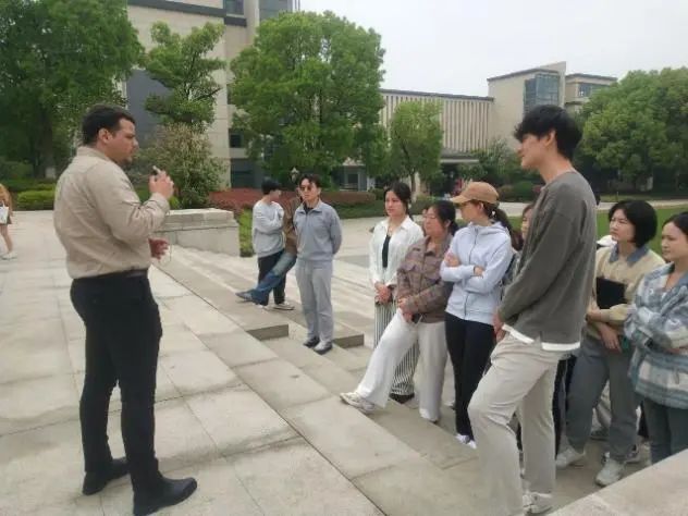 这是发生在《国际领队》实践课堂上的一幕。4月11日上午,william威廉中文官网国际文旅系范文艺老师带领员工走出教室,进行《国际领队》课程实地情境模拟教学,从迎接外宾到带领外宾参观校园,全面考验员工的线路规划能力、语言表达能力和临场应变能力。