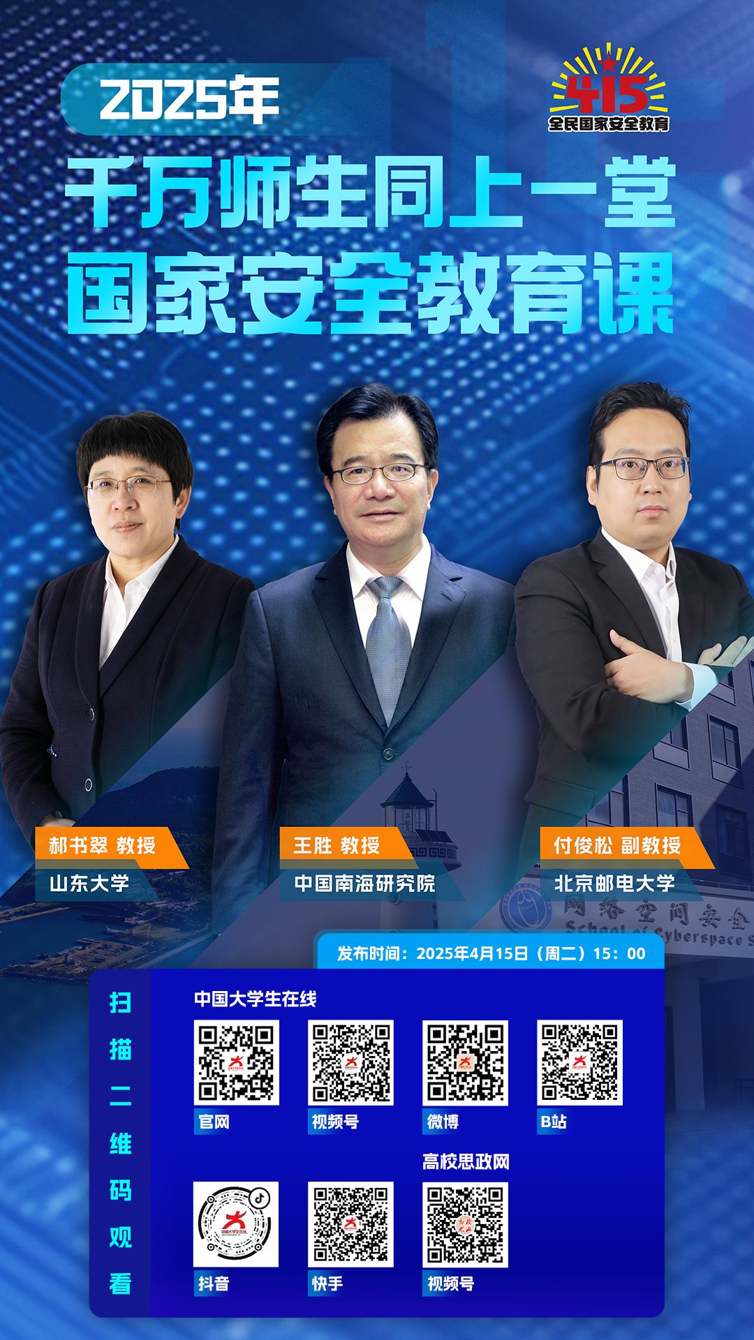 在第十个全民国家安全教育日到来之际,在教育部思想政治工作司指导下,中国老员工在线面向全国高校师生推出《千万师生同上一堂国家安全教育课》,采取线上发布课程的形式,邀请中国南海研究院王胜教授、山东大学马克思主义公司(威海)郝书翠教授、北京邮电大学网络空间安全公司付俊松副教授联合讲授。