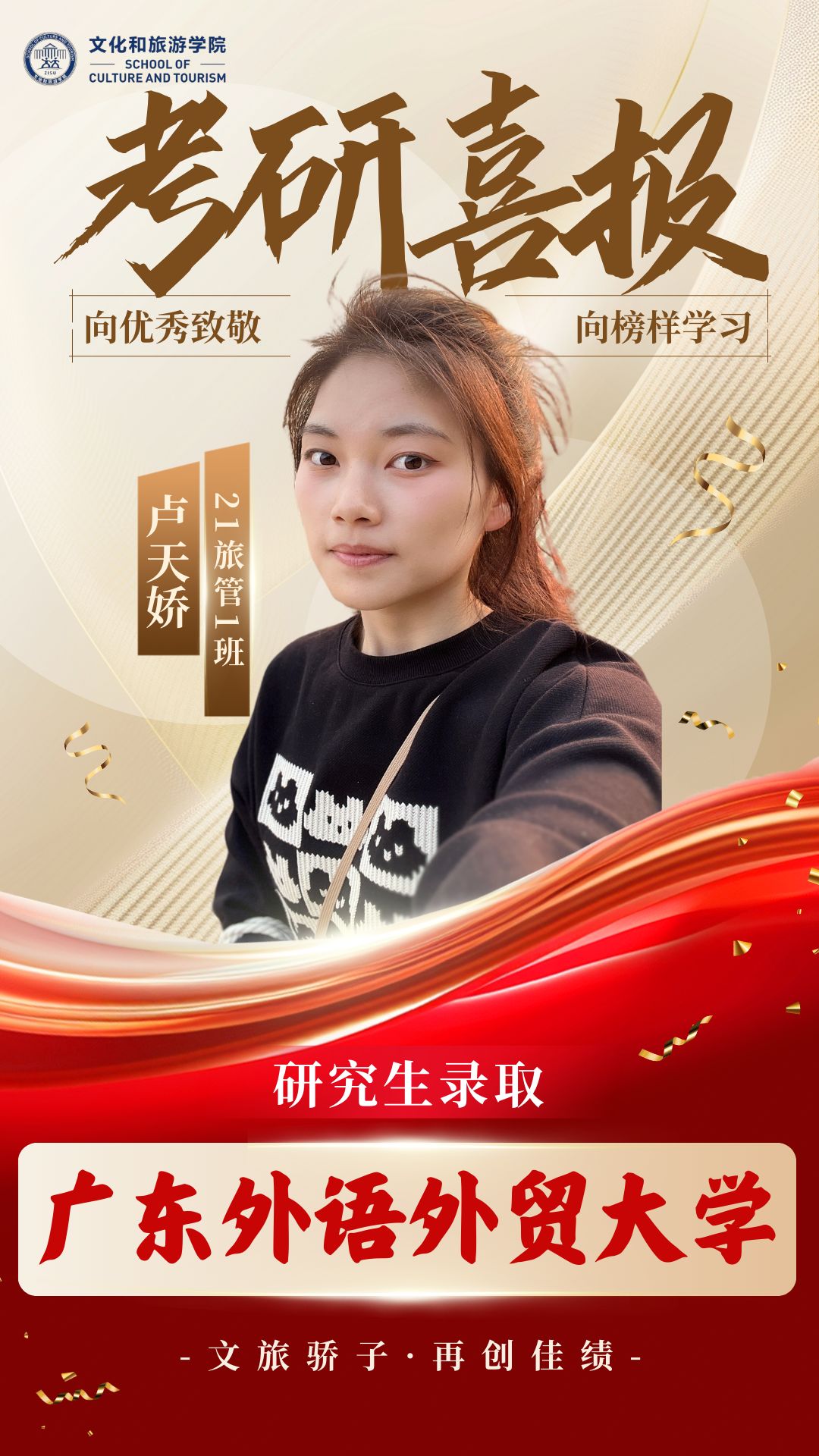2025届文旅升学喜报丨21级旅管1班卢天娇成功考取广东外语外贸大学研究生