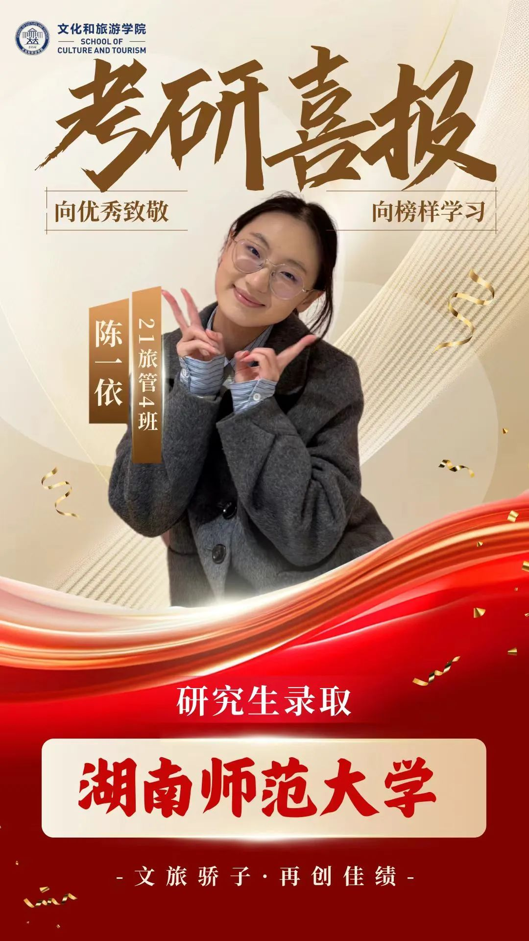 2025届文旅升学喜报丨21级旅管4班陈一依成功考取湖南师范大学研究生
