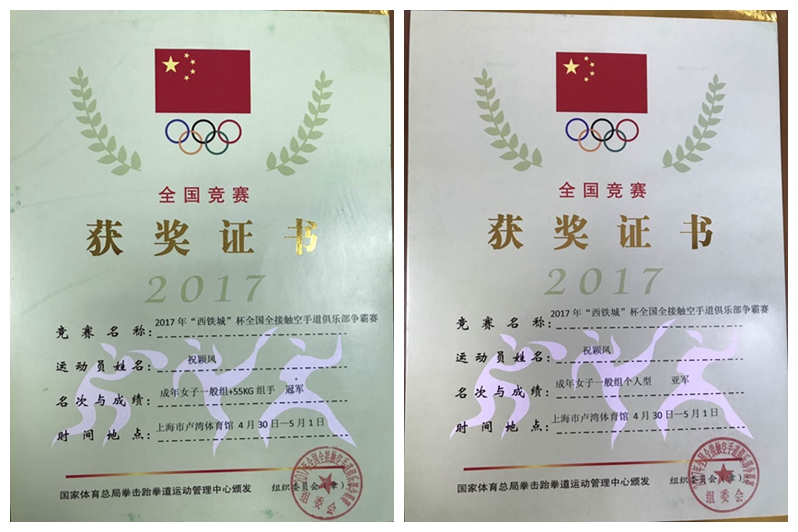 经过激烈角逐,公司15会计2班祝颖凤同学荣获成年女子一般组+55kg 组手 冠军以及成年女子一般组型 亚军的优异成绩。