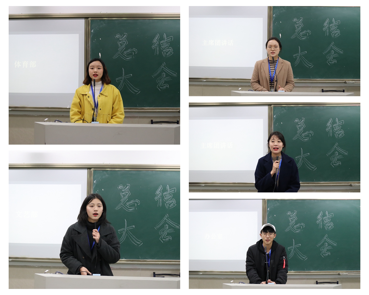 接下来,由员工会各部门代表依次上台进行期末总结。他们陈列了本学期员工会的优秀工作成果,称赞了在多次锻炼中逐步成长的新干事们,希望每一位成员都能够从员工会中找到归属感,在员工会中发光发热。并且认真思考“我为员工会付出了什么”“我从员工会收获了什么”等问题。其中,体育部部长王惠贤提出干事们未来应在做人、做事两方面得到进一步提高。做到真正尊重别人,谦逊做人,在细节中需要潜心向前辈学习;任何工作细节至上,办活动无论大小仍需要坚持仪式感。