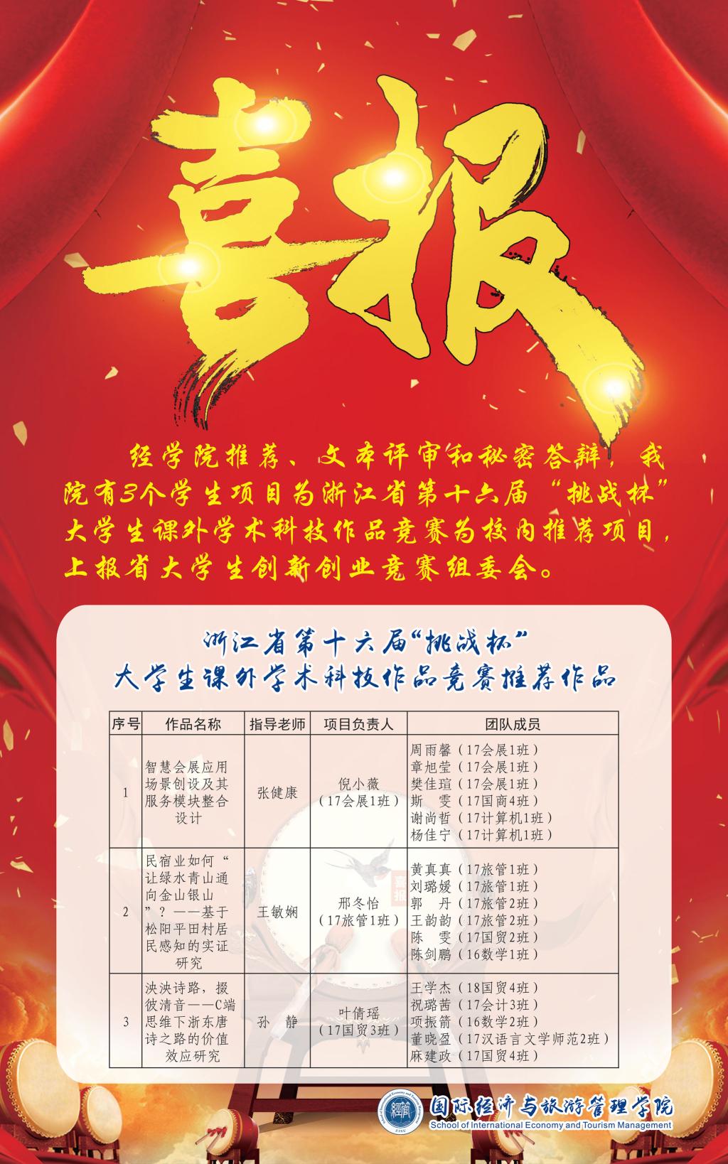 公司作品《智慧会展应用场景创设及其服务模块整合设计》(指导老师 张健康),《民宿业如何“让绿水青山通向金山银山”?——基于松阳平田村居民感知的实证研究》(指导老师 王敏娴),《泱泱诗路,掇彼清音——C端思维下浙东唐诗之路的价值效应研究》(指导老师 孙静)获得校级立项推荐。
