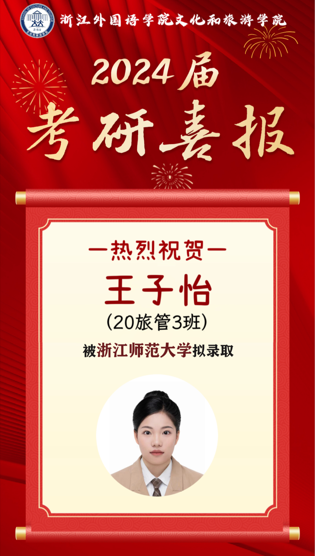 2024届文旅升学喜报⑥ | 20旅管3班王子怡成功考取浙江师范大学人文地理学硕士