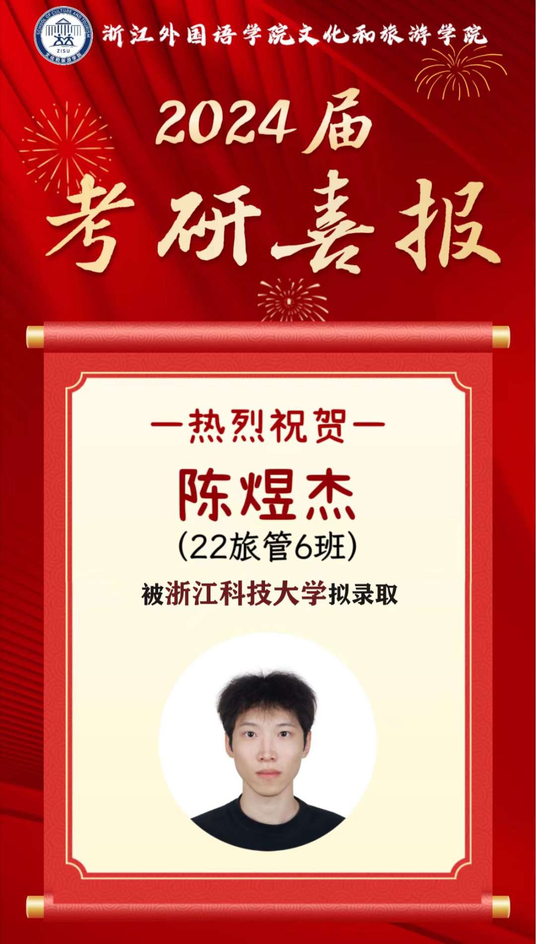 2024届文旅升学喜报⑪|22旅管6班陈煜杰成功考取浙江科技大学应用统计专业硕士研究生