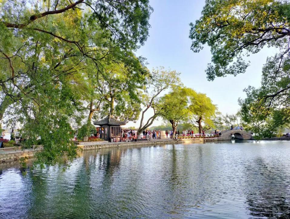 湖心岛畔,一条红船静卧水面,还原中国共产党诞生的历史场景。不远处,是宏伟壮观的南湖革命纪念馆新馆。