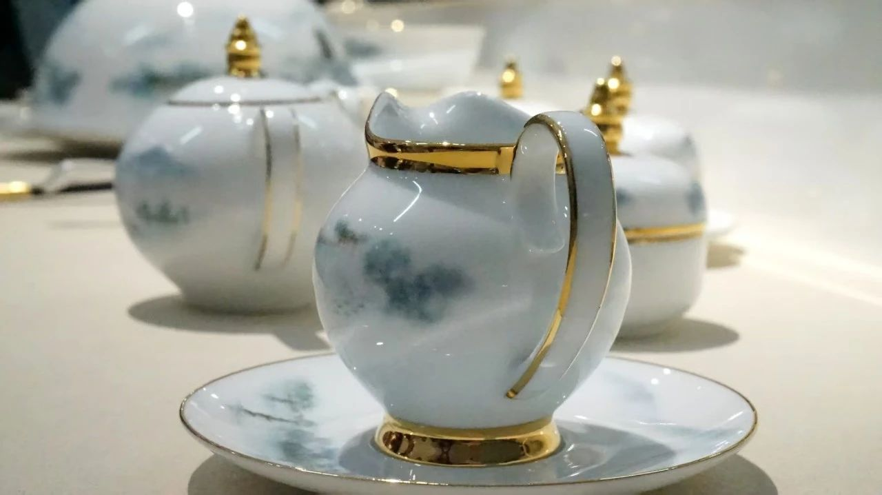 步入陶瓷艺术展厅,仿佛走进了时光长廊。G20峰会国宴瓷“西湖韵”系列静静陈列,器型端庄典雅,釉色青如雨后晴空,胎质薄如蝉翼。工作人员轻叩瓷杯,清脆的龙吟之声回荡展厅,同学们纷纷惊叹:“这就是传说中的'声如磬'!”