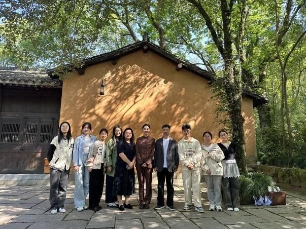 在王丽利总监的带领下,师生踏入这座毗邻景区的酒店,感受清幽古朴的氛围。王丽利总监讲解了法云安缦酒店的品牌故事、历史沿革和文化底蕴,其所在的法云村曾是茶民聚居地,经过统一设计规划,完整保留了村落风貌。酒店的建筑皆循旧址重建,与周边山林完美融合,与自然环境相得益彰。