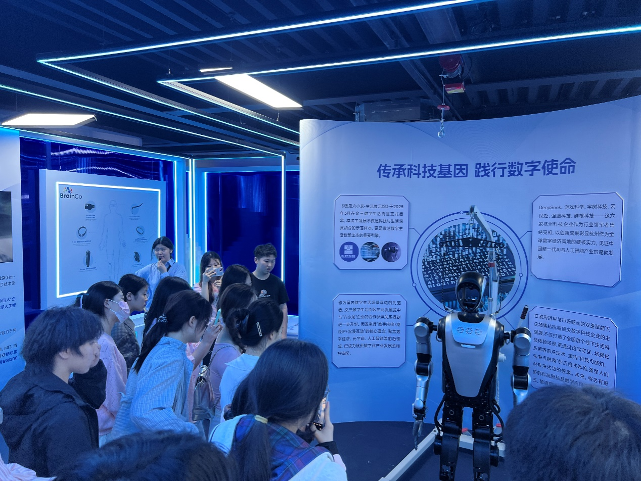 4月21日下午,由文旅菁英荟、团委青志协携手举办的科技探秘活动在“遇见杭州六小龙”生活展示馆圆满落幕。公司党委书记范芸芸、党委副书记黄瑾、副经理王敏娴和辅导员吴嘉斌带领17位青年学子穿越虚实边界,在具象化的科技场景中触摸未来脉动。木塔教育科技(杭州)有限公司总经理虞佳乐、副总经理张杭美等接待来访一行。