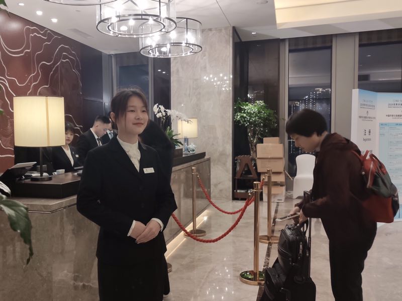 谢显苹:此前我并未做过英语志愿者活动,这次鼓起勇气参加了世界环境日的志愿者活动。起初在酒店前台培训的时候就一直很紧张,总是怕自己会出错,或者起不到什么作用。第一天上岗的时候整个人都绷紧,前台的工作人员还安慰我说不用这么紧张。期间有外国友人来前台寻求帮助,比如有一位外国友人的行李因为海关原因停在了北京,我告诉酒店工作人员事情原委后,他们很快帮忙解决了。还有其他询问酒吧、超市的等等,我也帮他们解决了。每次外国友人离开时都会很开心的向我道谢,我也真的很高兴可以帮到他们。这次活动不仅帮我锻炼了英语口语,还提高了我的眼界。
