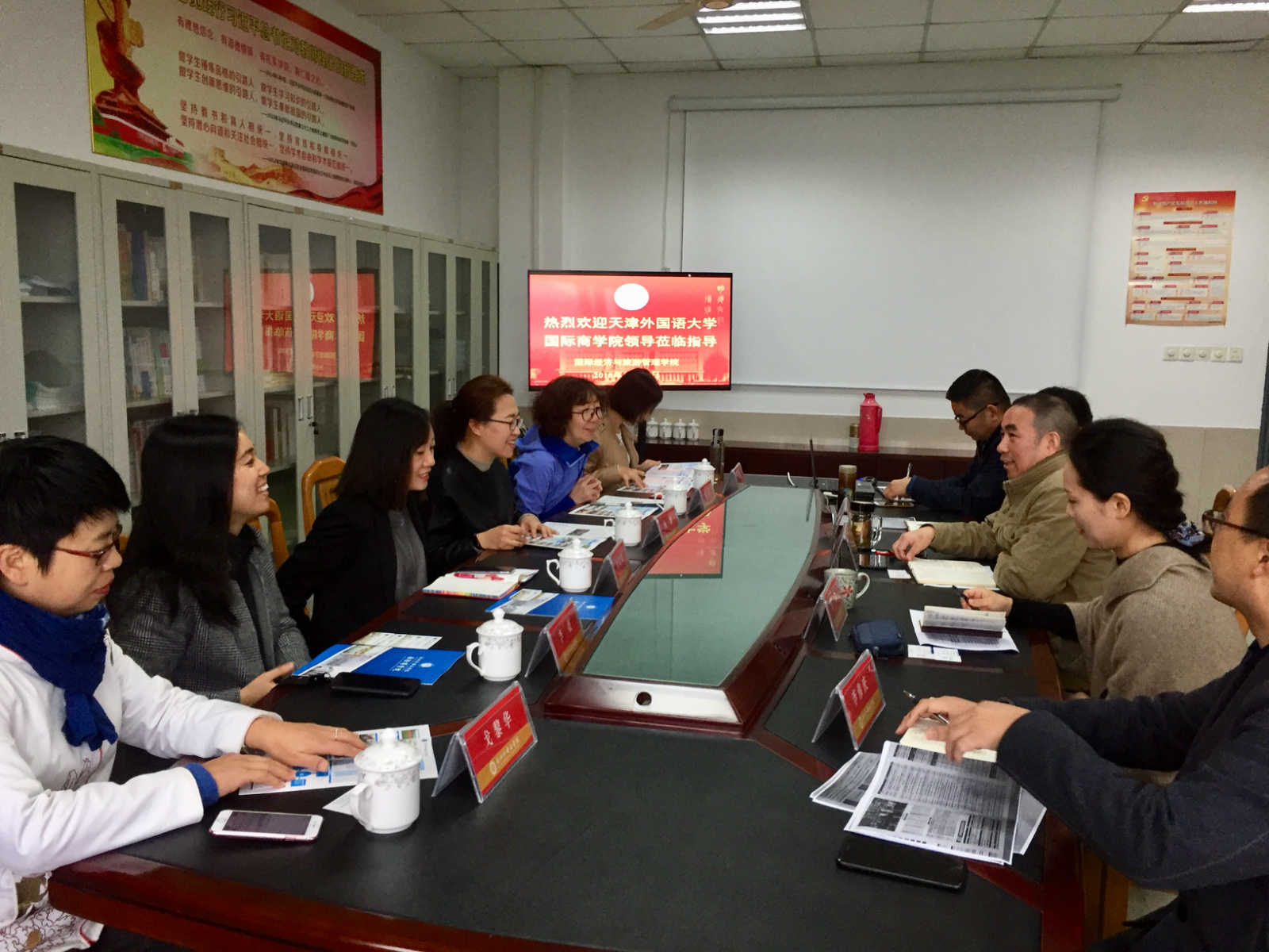 天津外国语大学国际商公司党委书记杨颖一行六人于11月12日来院交流指导,双方就各自团队建设、课程设置、实验室和实习基地建设、国际合作与交流、员工创新创业等方面的做法和经验进行了充分的探讨和交流,就有关问题进行了深入探讨,明确了双方今后努力方向和合作领域。